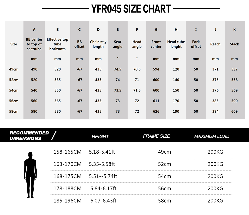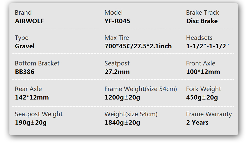 Product DescriptionFrame Details Gravel Bike Frame Frame Material T1100 Toray Carbon Fiber Frame Type Cyclocross Bike Frame Carbon Weave UD Bottom Bracket BB68 (46*86.5mm) Finish Matte or Glossy Headsets 1-1/2" to 1-1/2" System Frame Gravel Bike Thru Axle Size Front 100*12mm , Rear 142*12mm Cable Routing Internal Cable Routing Type Gravel Seatpost 27.2mm Front Derailleur Stationary type Disc Rotor Size 140mm or 160mm Suitable Derailleur Di2 or Mechanical Weight Frame 1200g (size 54cm) , Fork 470g , Seatpost 190g Max Tire Size 700*45C ,27.5*2.1inch Frameset Include Frame,Fork,Headsets,,Seatpost,Clamp,BB Transfer,Thru Axle Rod Warranty 2 Years ![]()
