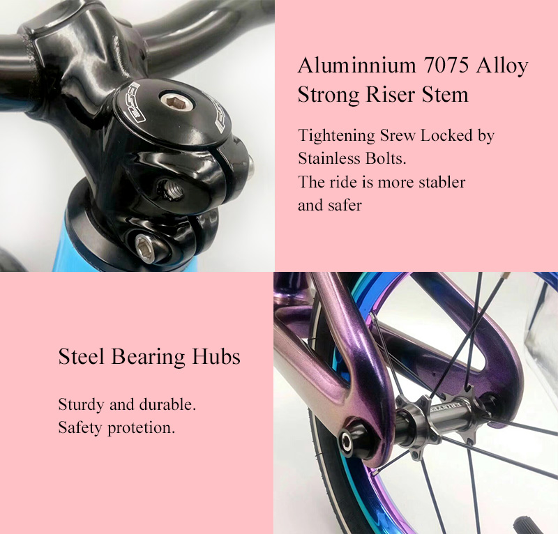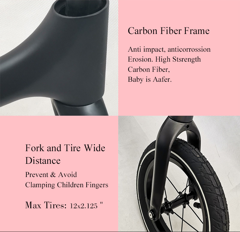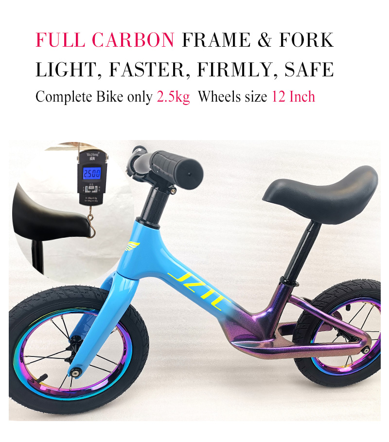 Bike Type: Kids Balance Bike Wheel Size: 12 1/2" Bike Color: Red/Green/Yellow/Sky Blue/Pink/Purple/black Bike Weight: 2.5kg Frame: Carbon Fiber Frame Strong Riser Stem: Aluminnium 7075 Alloy Fork: Carbon Fiber Hub: AL alloy superlight with bearings Rim: AL alloy superlight double-deck Max Tires: 12x2.125" Grip: Comfortable with Anti-collision protection Saddle: Lightweight and Comfortable in Seat Post